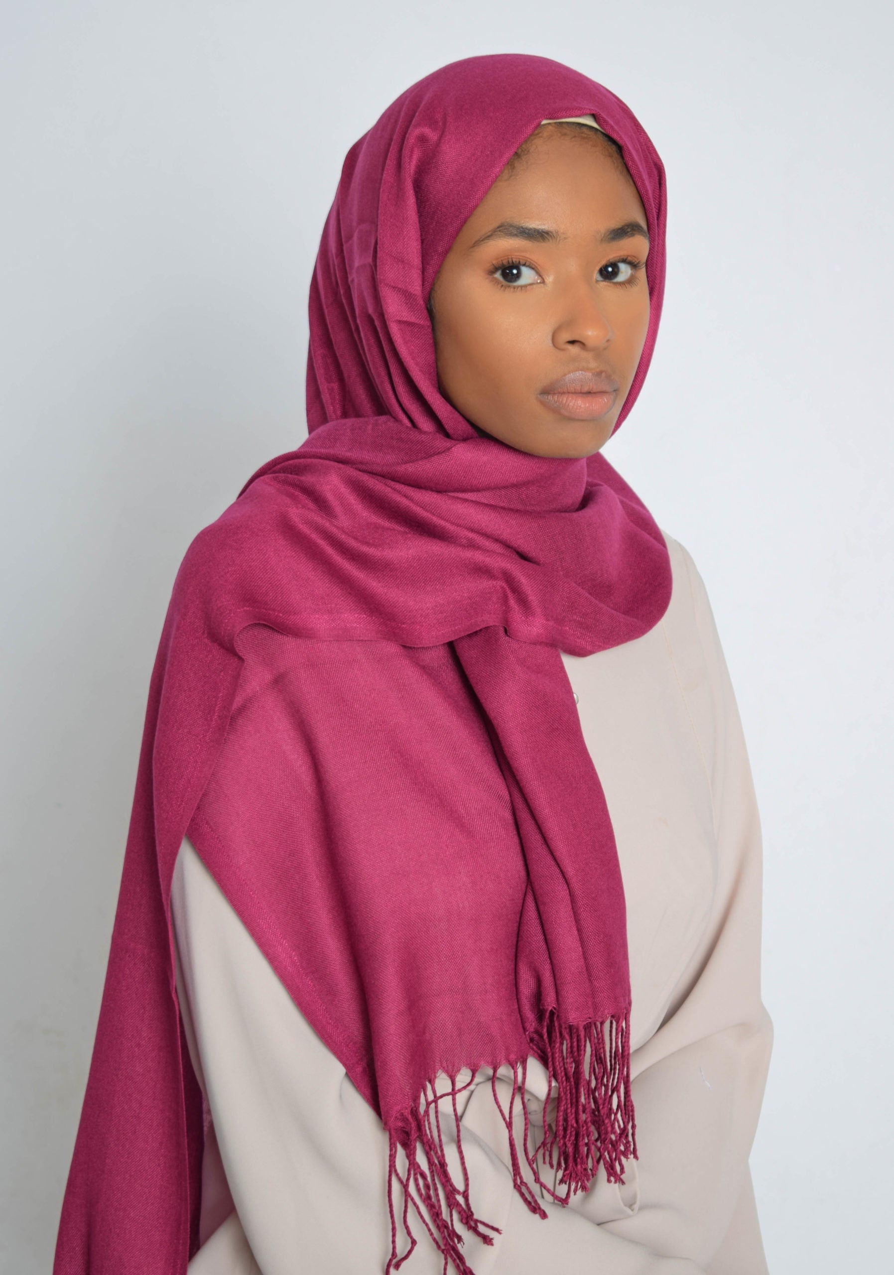 Plum Plain Hijab made by natural fibres, gives a soft, easy, comfortable feel and use. Plus a higher capacity of holding moisture, It aslo has a fringe in the ends.